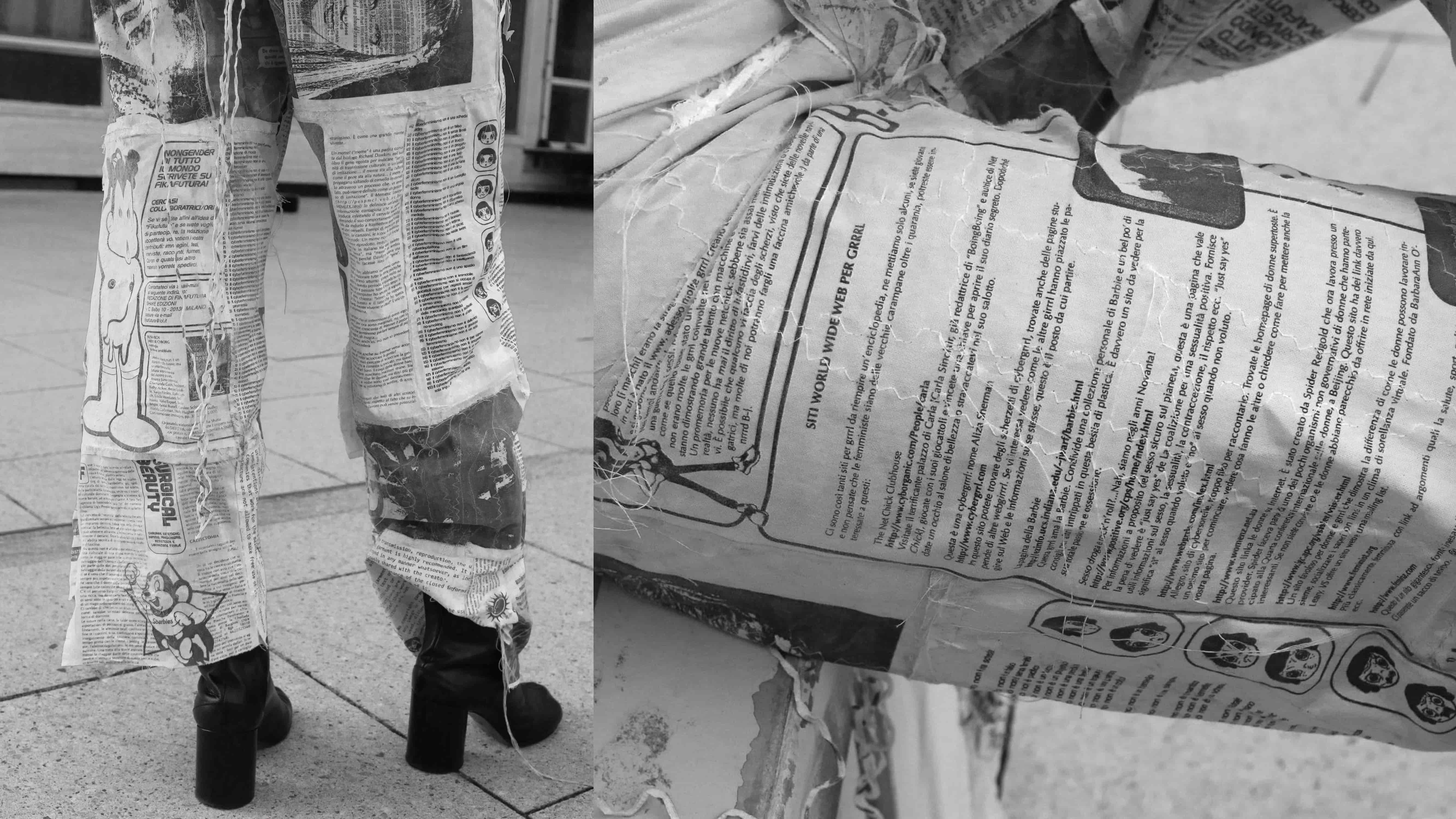 In Expanded Edition 00, there are different volumes, each defined by a specific fanzinography. We coined this term to delineate a set of references that avoids a traditional cataloguing system. The fanzinography is attached to the XEROXED garments to allow the reader-wearer to get to know the materials consulted and employed for the development of the volume. In each volume we curate a selection of archival materials that are then translated onto the textiles with a diverse range of printing techniques. We work carefully by mixing analogue processes in order to not lose the material quality and tactility of the mimeographed contents, aiming to keep alive their grainy, inky visual power.