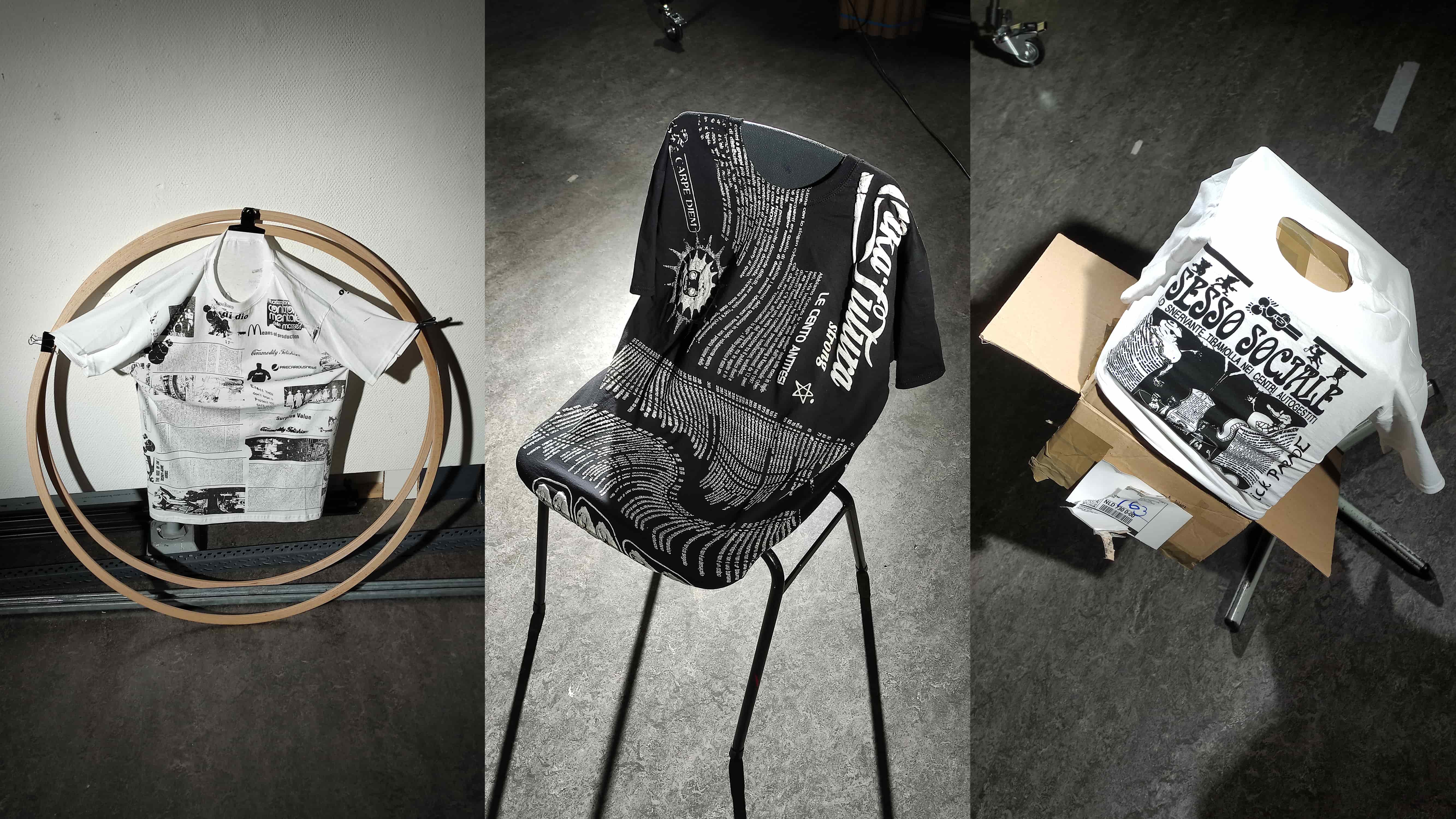 We choose the printed garment as our primary publishing medium with the goal of circulating the content in the public sphere. Through the act of reading-wearing, the garment is transformed into a wearable page, a walking tazebao that spreads underground culture. It is the space for the recontextualization of forgotten typefaces, logos, and layouts.