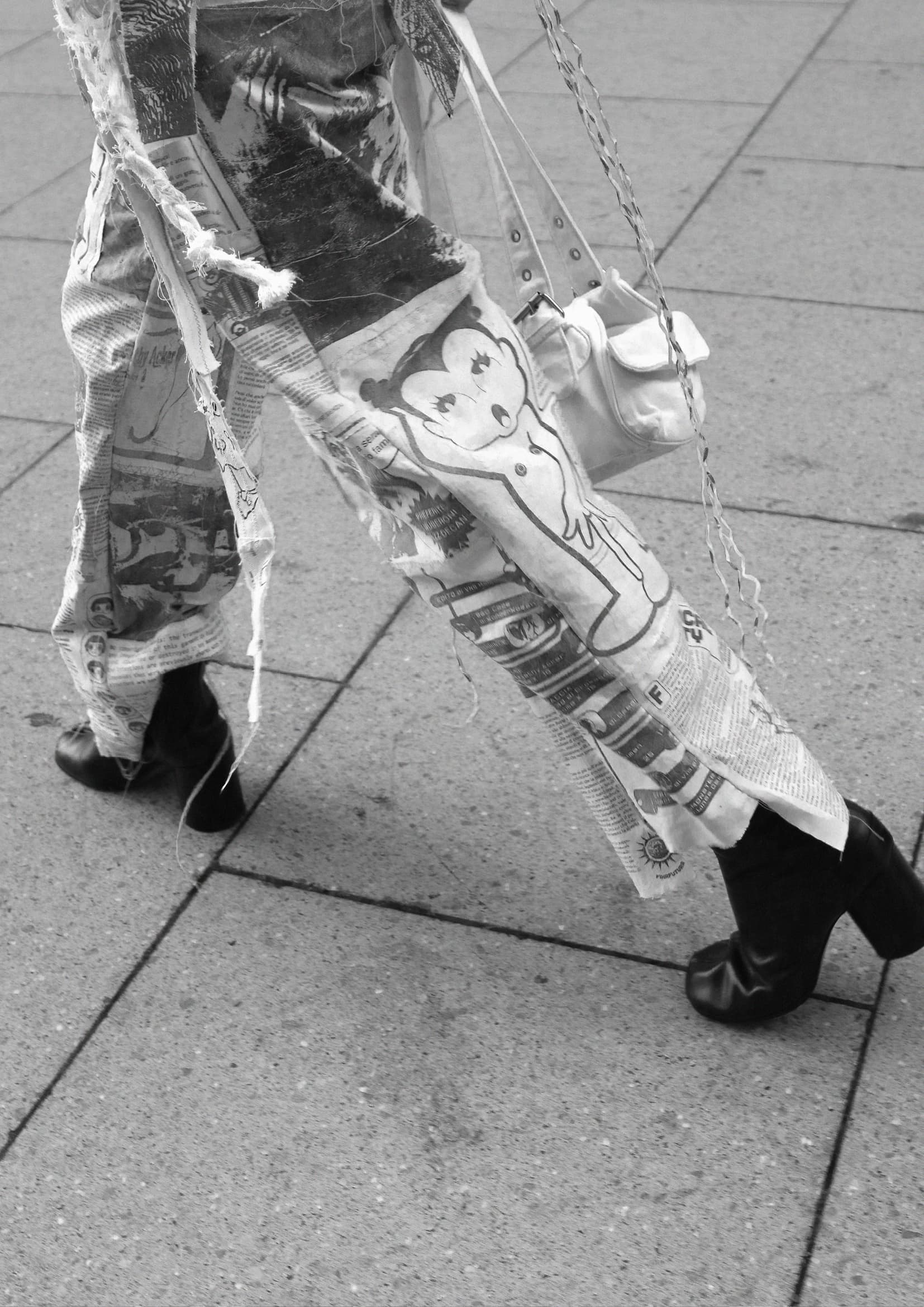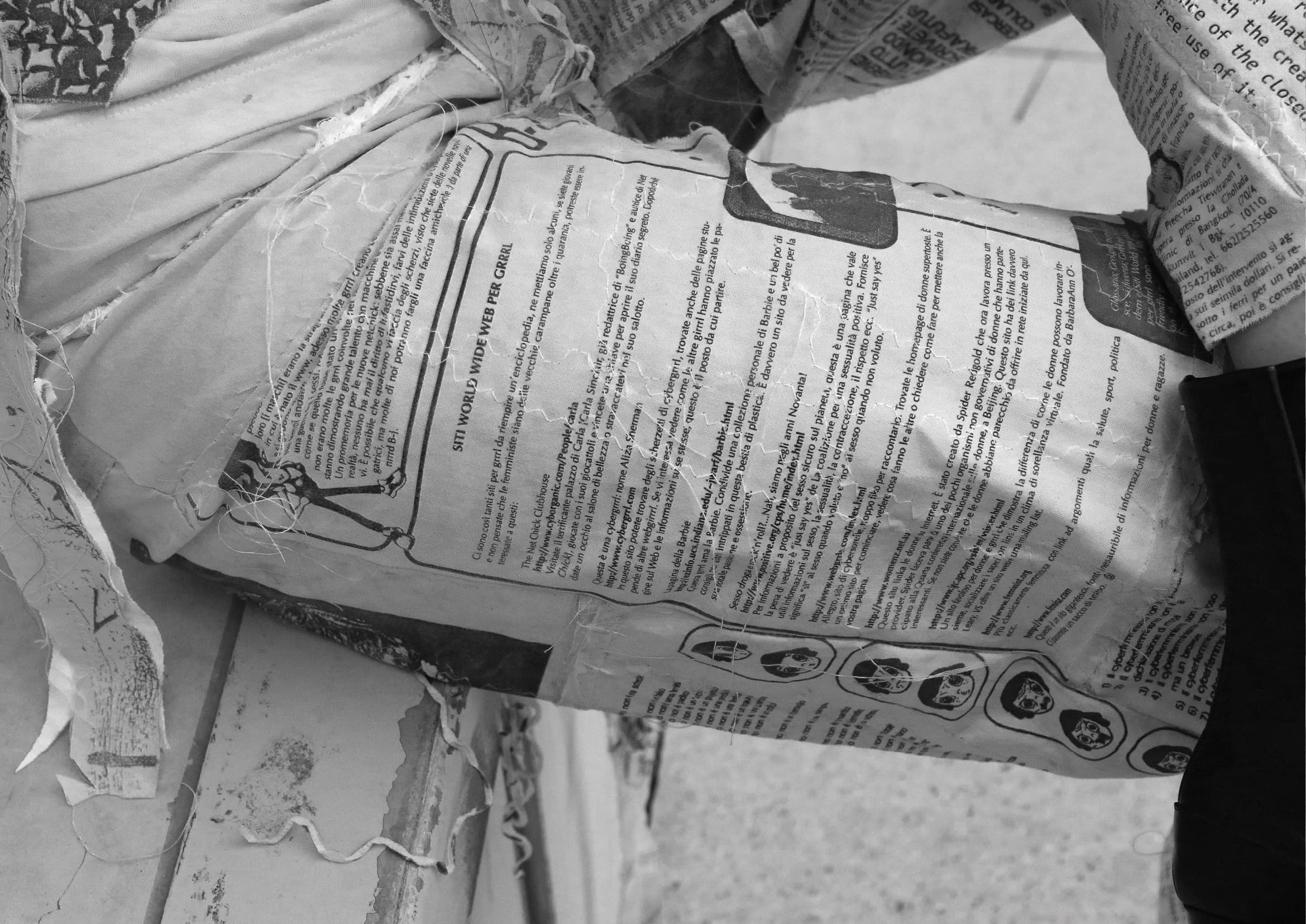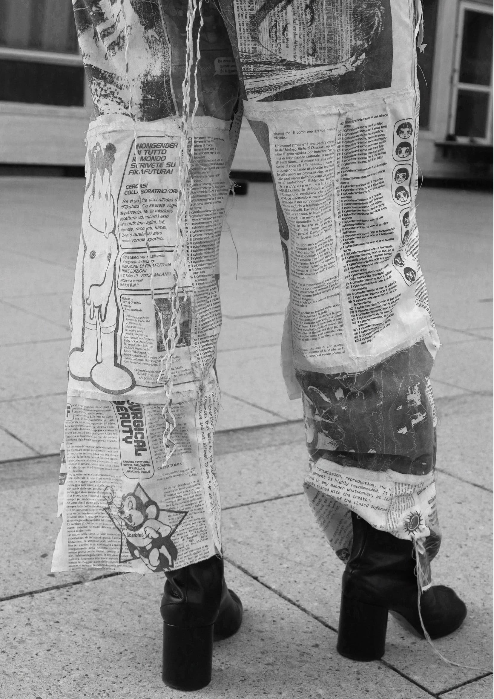 The XEROXED geek trousers are a unique piece, the result of an intervention of cutting and patchwork carried out on a reprint on fabric of the first issue of Fikafutura: secrezioni acide cyberfemministe e queer, brought out in 1997 as a supplement to the triple issue nos. 6–7–8 of Decoder Rivista Internazionale Underground, published by Shake Edizioni Underground and free from copyright.