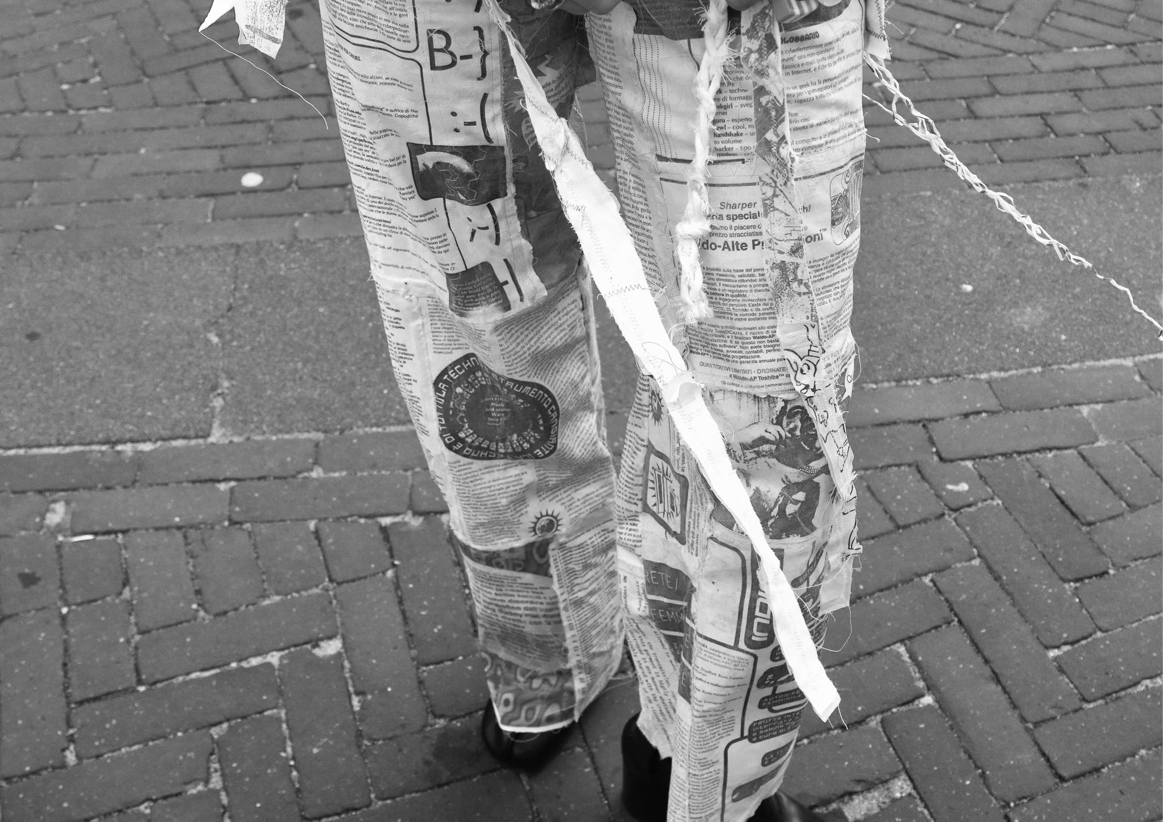 The trousers were created by patching together circa 20 A4 sheets of light cotton previously printed with a domestic xerox machine. The ink will slowly expand and fade over time.