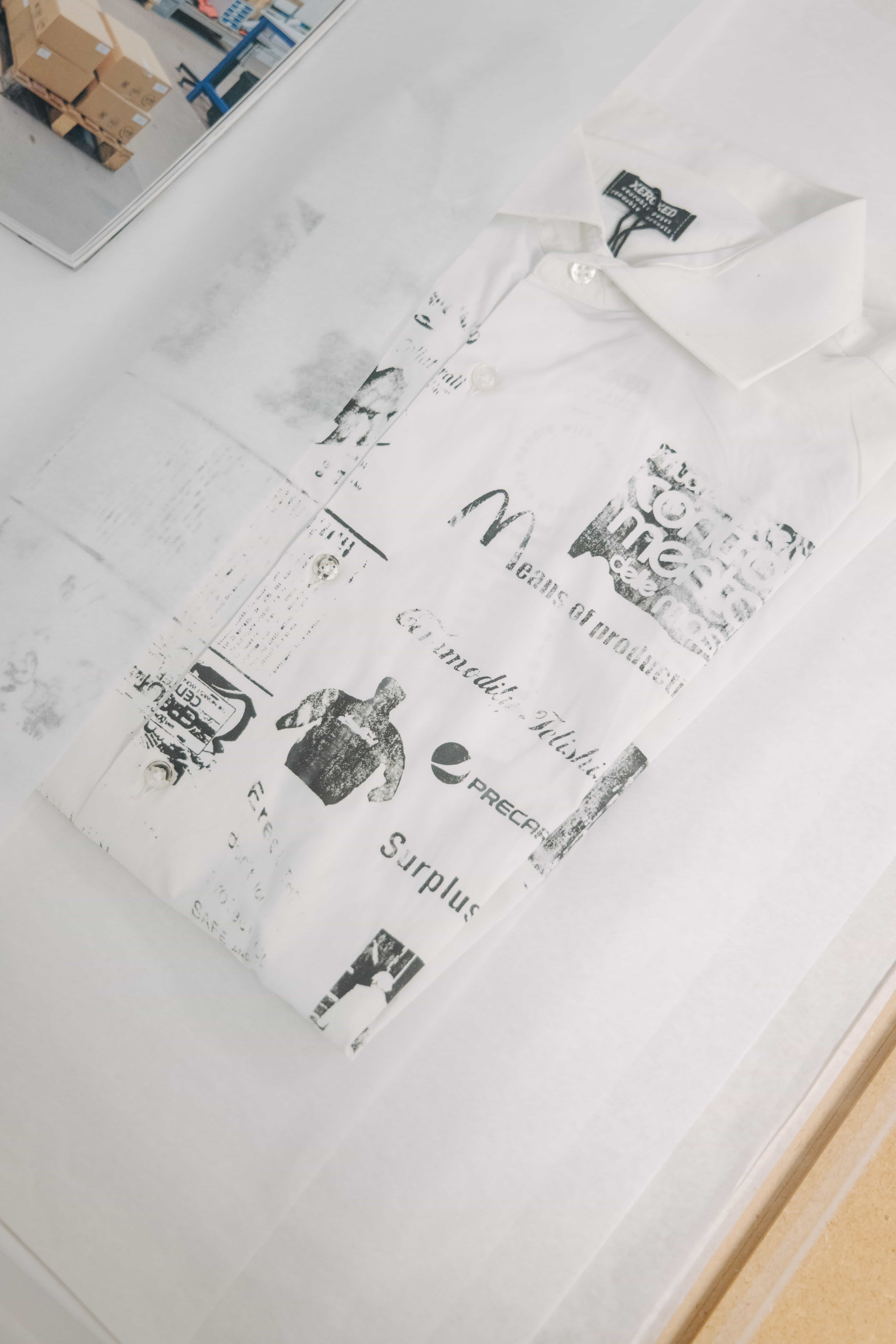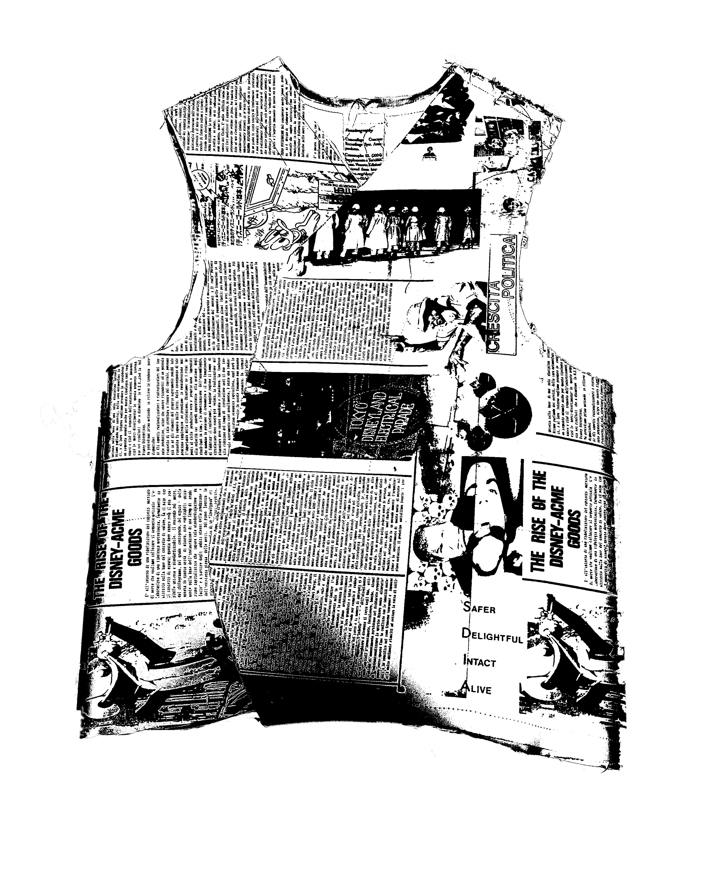 The paper waistcoat was developed starting from an article retrieved from a special edition of Decoder Rivista Internazionale Underground, published in 1992 and edited by Shake Edizioni. The text has been re-elaborated and combined with other images, letterings, and symbols extracted from the XEROXED archive, and then printed in silkscreen on cardboard and fabric. The waistcoat was developed for the durational performance You Can't Brek The Resistance, conceived with performer Antti Uimonen in January 2022 in Arnhem, The Netherlands.