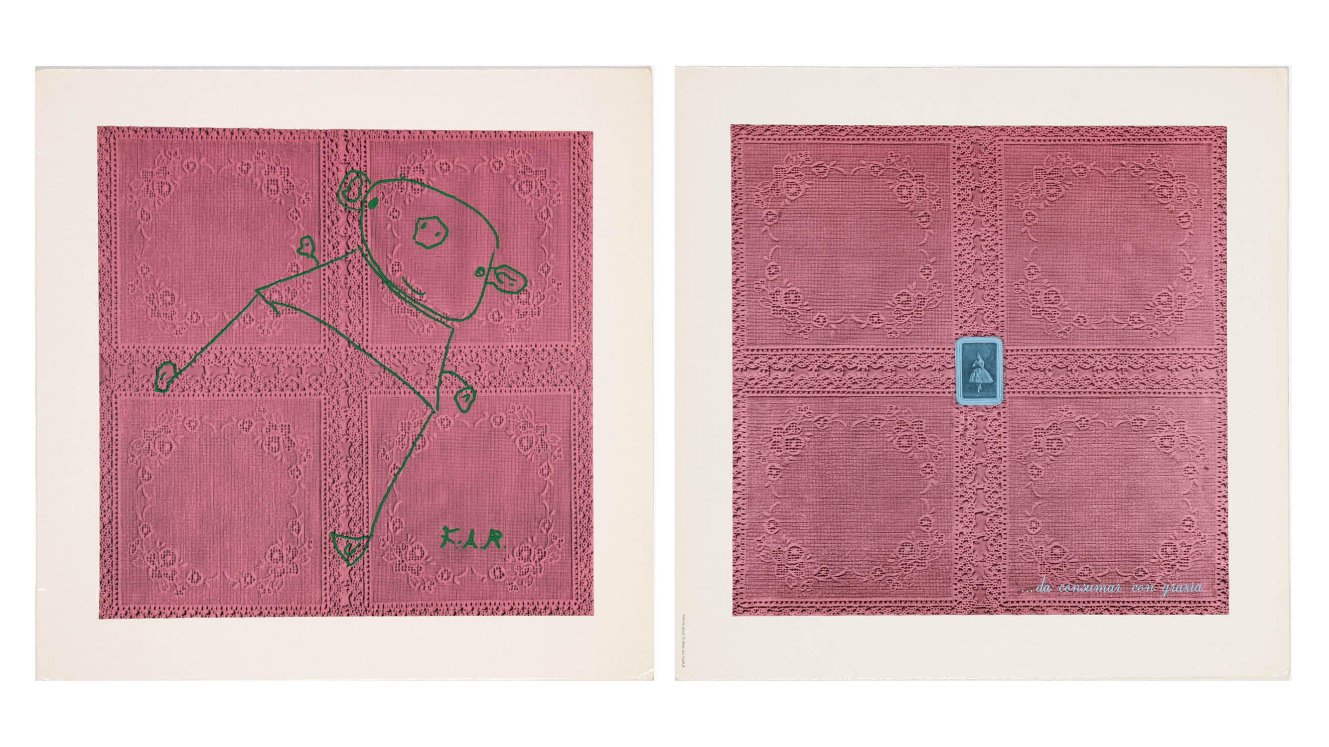 The album was originally published in 1985 in a limited edition of 1000 copies and is titled “Da Consumarsi Con Grazia” (“Handle with Grace”) which I always thought was an evocative title. The LP’s front cover features a rough, childish drawing of a green pig on a saturated pink lace background, while the back cover displays, right in the center, a blue card depicting a tiny lady wearing a dress with a large gown, presumably dating back to the 1700s. Inside the packaging, the vinyl is transparent and the album title and track list are written in italic with a serif typeface, with the song titles being whimsical as the packaging itself: “Lucciole preservate” (“Preserved Fireflies”), “Gesti Rapiti” (“Captured Gestures”), and “Ninna Neta” (“Lullaby”).