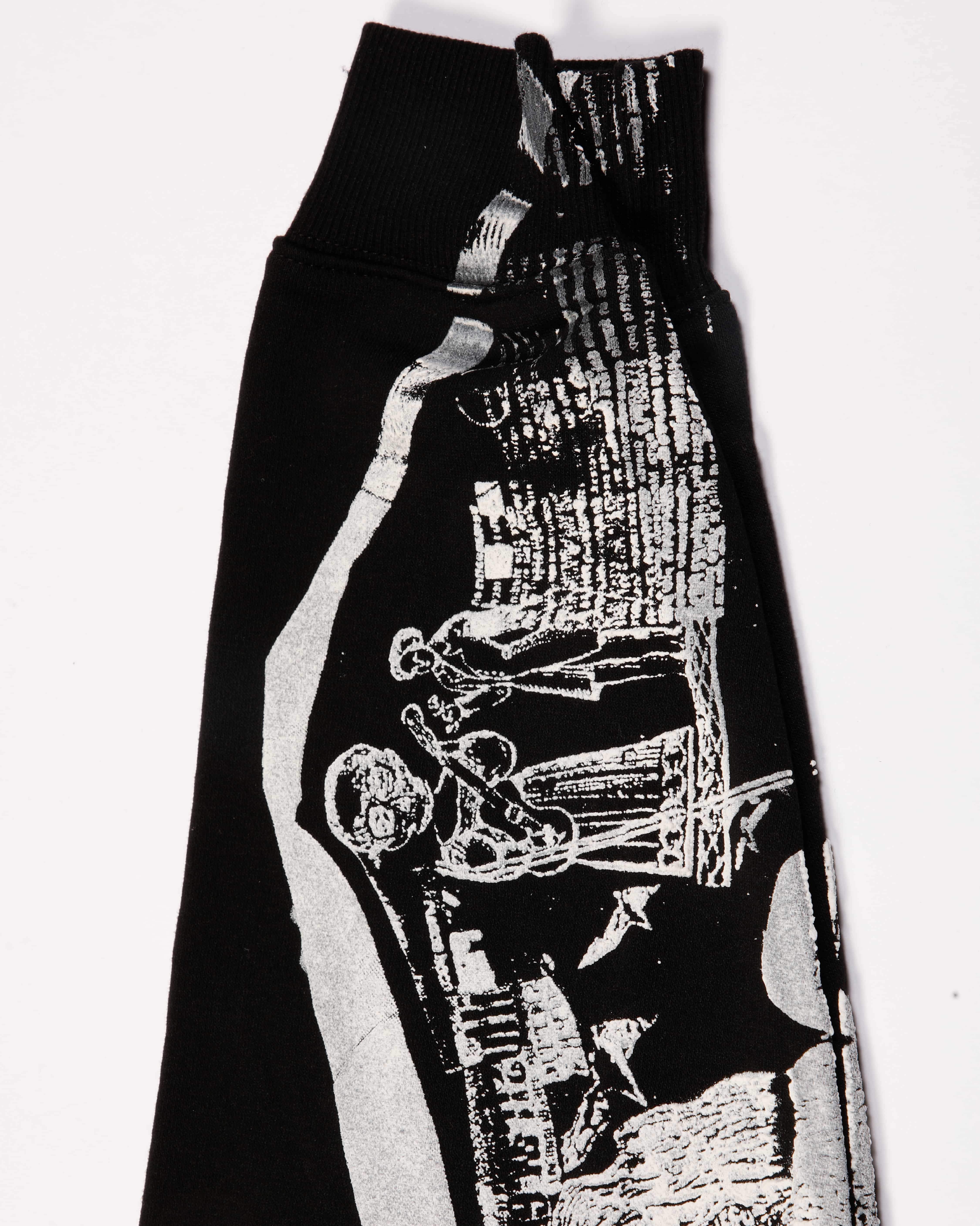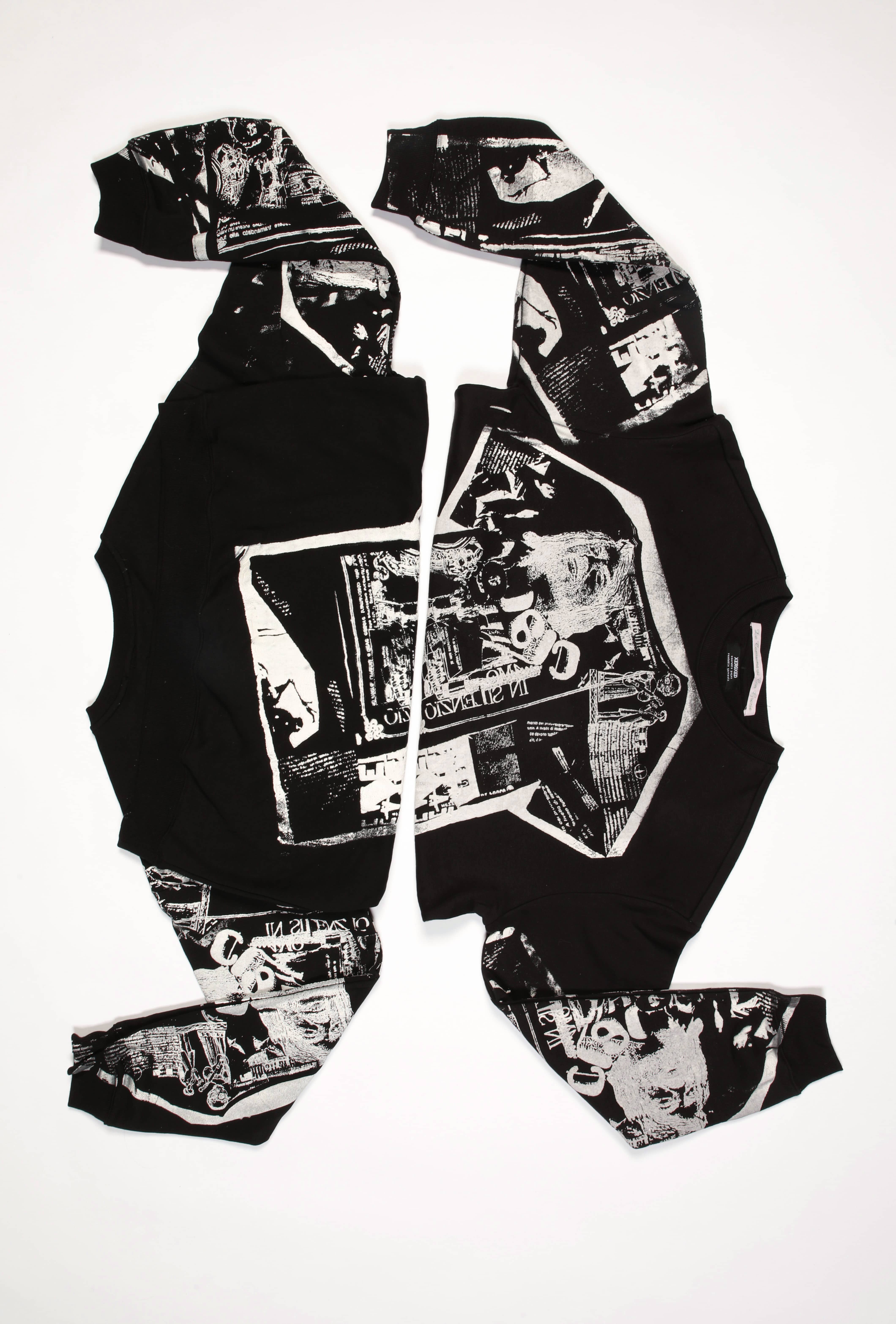 Thanks to this technique—where the ink ‘puffs up’ when exposed to high temperatures—the lady becomes almost tactile and grainy as the lace on the cover of the “Da Consumarsi con Grazia” LP. The meta-T-shirt printed on the sweaters was created entirely through analogue methods: taping the silkscreen frame, ripping and cutting the artwork here and there. The garments are then patchworked directly on the silkscreen table, allowing me to print them all at the same time. This process creates a sense of continuity between the sweaters, with each one complementing the other.
