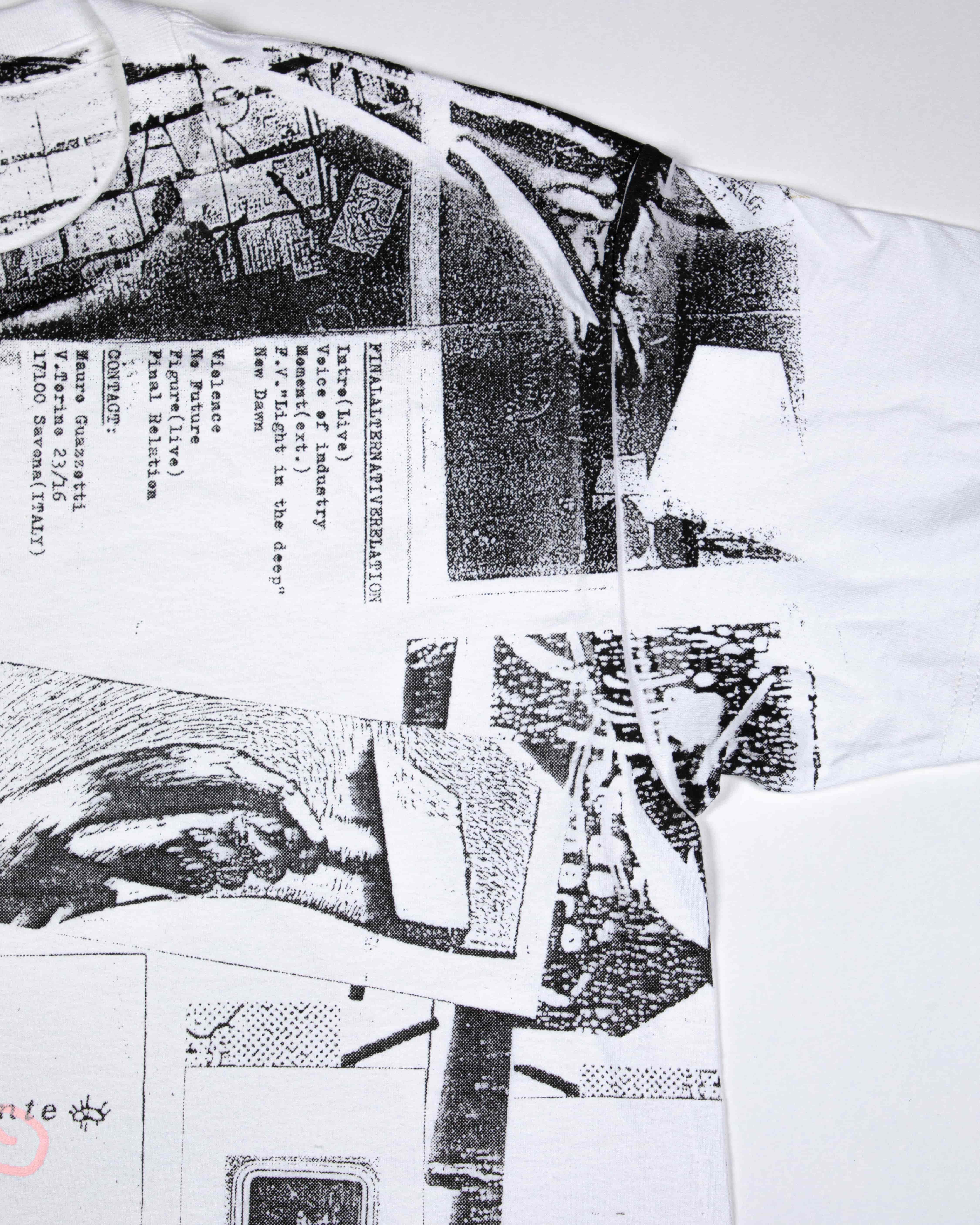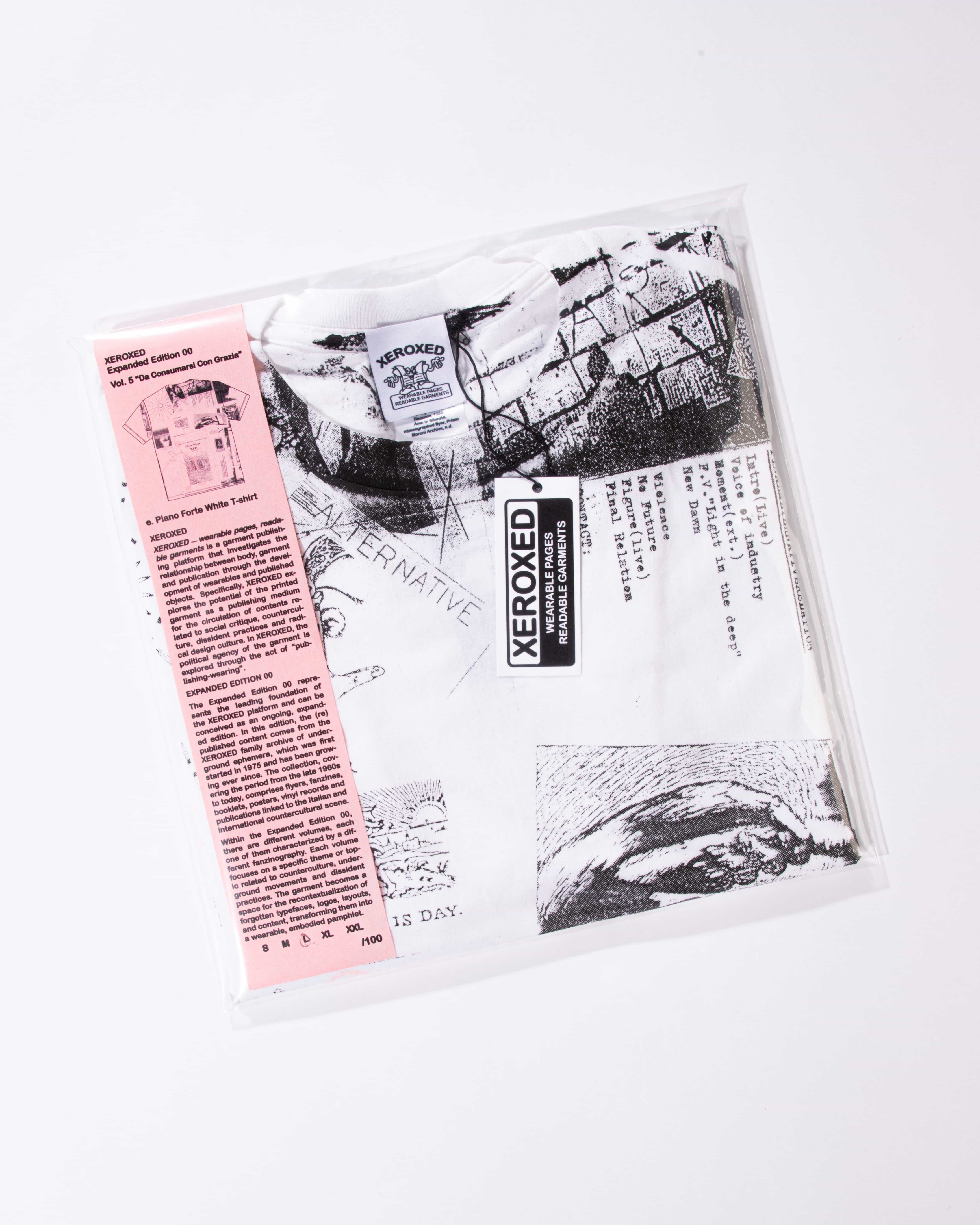 XEROXED Vol. 5 “Da Consumarsi with Grazia” is a garment series including four T-shirts, one sweater, and one foulard. Unlike previous Expanded Edition 00 volumes, this one does not include an extended fanzinography or external contributors. Instead, it was designed around a single object extracted from the XEROXED archive of underground ephemera: a vinyl album by F:A.R. (Final Alternative Relation), one of the first post-industrial Italian bands, founded in 1980 in Savona.